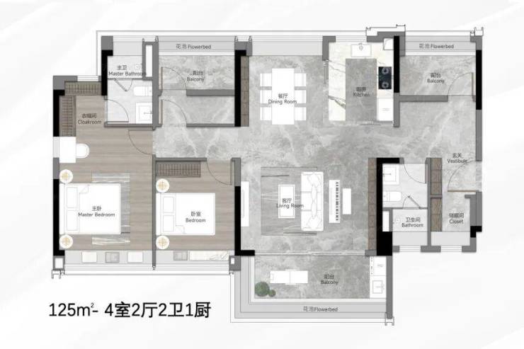125㎡户型则侧重动静分区,大方厅设计增强空间通透感