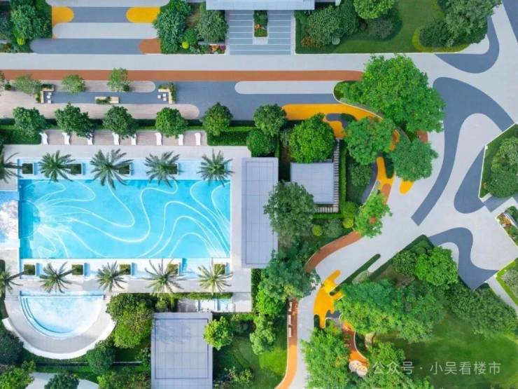 小区泳池两边种了高大的银海枣,颇有海岸度假风情,做了一个超大泳池和儿童池,展现园林优势。