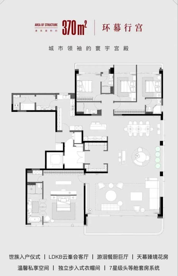 278-370㎡的环幕平层设计,带来无与伦比的空间享受,适合高端家庭。