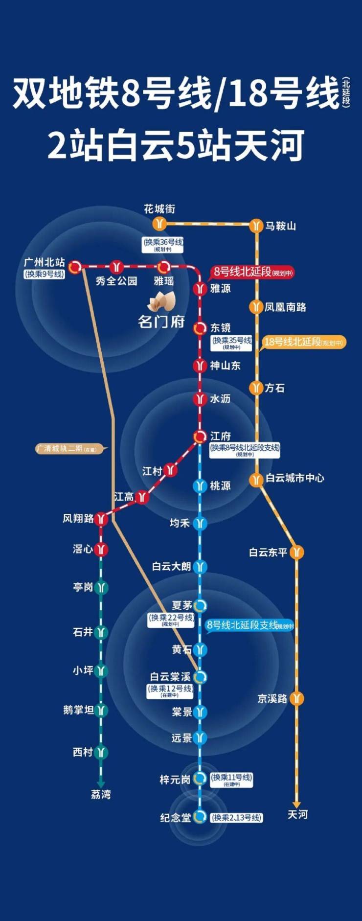 地铁利好:双地铁8号/18号线北延段均已开工,约500m到8北线雅源站(规划中)地铁口,3站北站、2站白云;经18北线凤凰南路站5站直达天河东