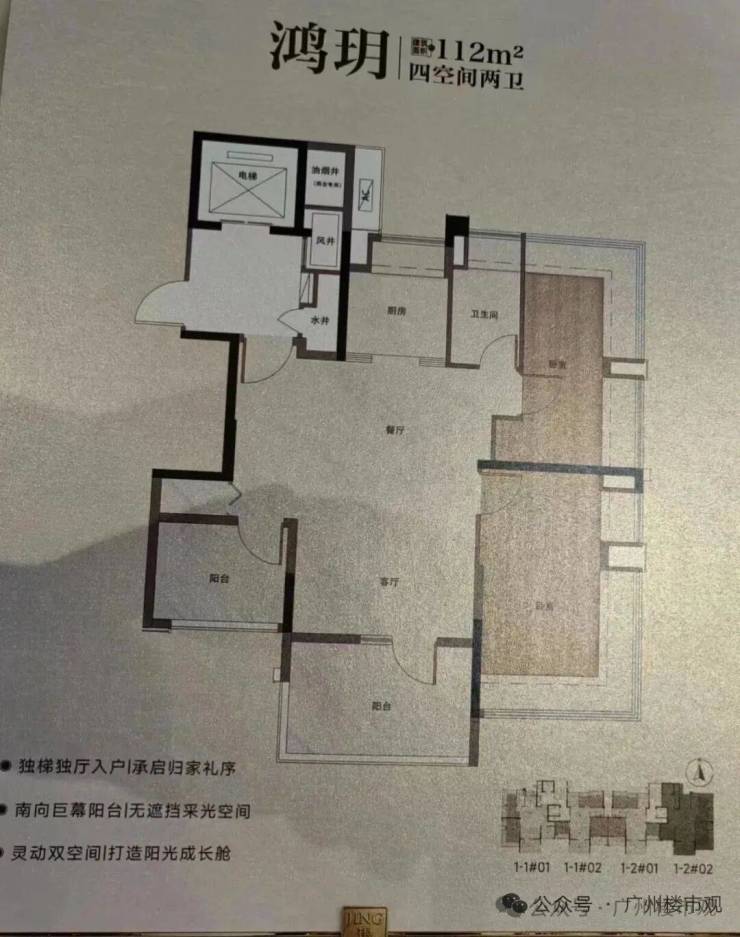 112㎡板楼户型图,2T2户,专梯专户+独立电梯厅,方正户型布局,三面环幕,采光一流。