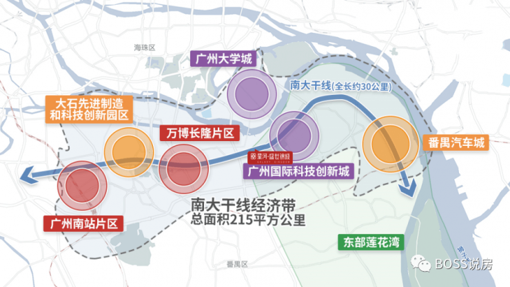 南大干线经济带——项目依傍南大干线,是联系珠三角东西岸的重要发展走廊。番禺现有高新技术企业1900多家,其中绝大部分均位于南大干线经济带,欢聚时代、希音、迪士普等产业巨头齐聚,真正撑起番禺的经济命脉。
