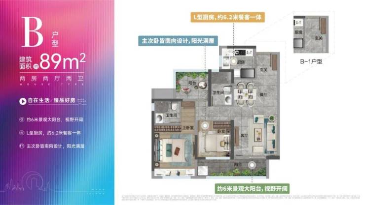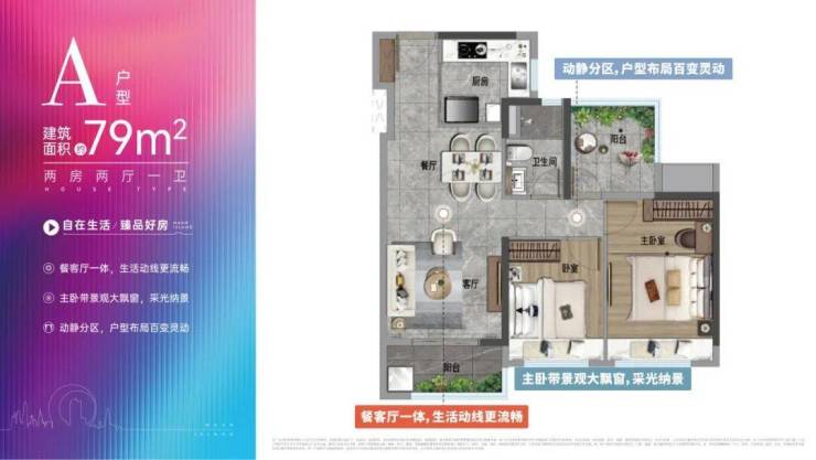 约79㎡两房两厅一卫是整个项目面积最小的户型,是典型的竖厅设计。