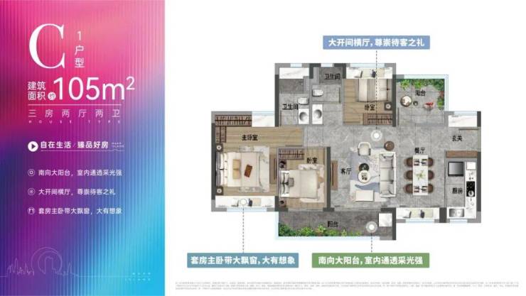 这个户型做了大横厅设计,且五开间朝南、南向大阳台连接客厅与次卧、玄关带飘窗、主卧带南北双飘窗,都大大提升了室内采光。