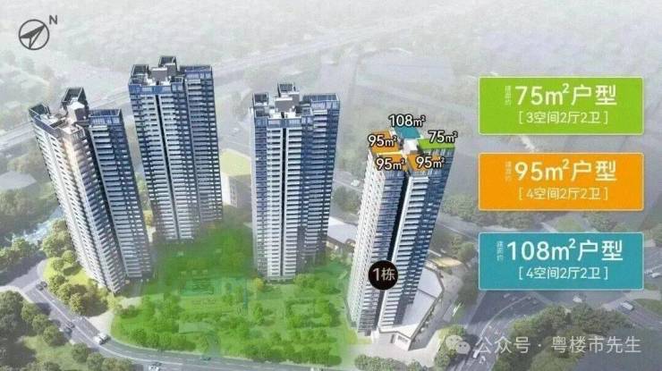 信达繁花里共配建了4栋31-32层高住宅,1、2、3栋是2梯5户设计,5栋是3梯5户设计,首开楼栋1栋,建面75-108平三至四房