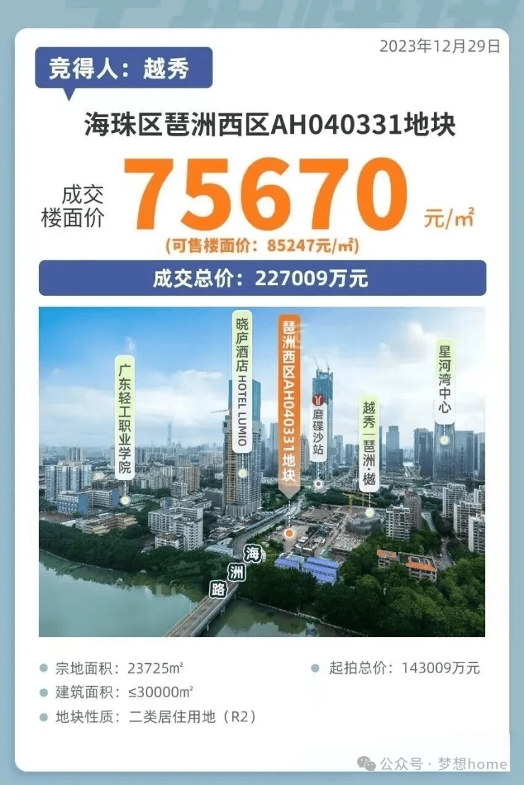 2023年最后一个工作日,琶洲西区AH040331地块被越秀地产广州区域摘得,折合楼面地价超7.5万/平,一度冲上全国地价TOP6。