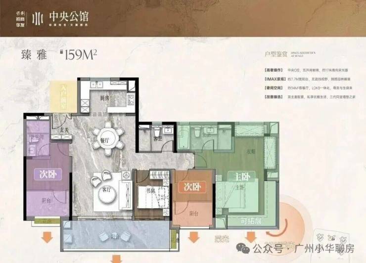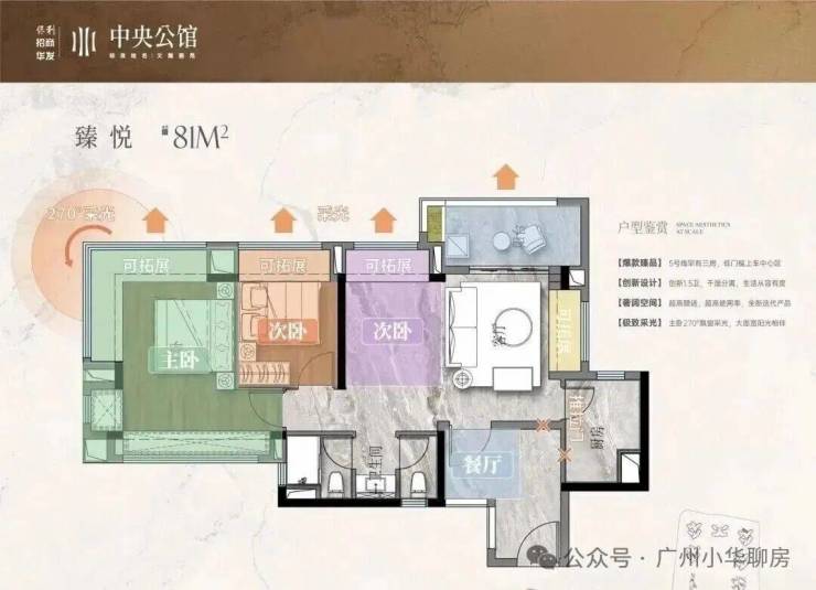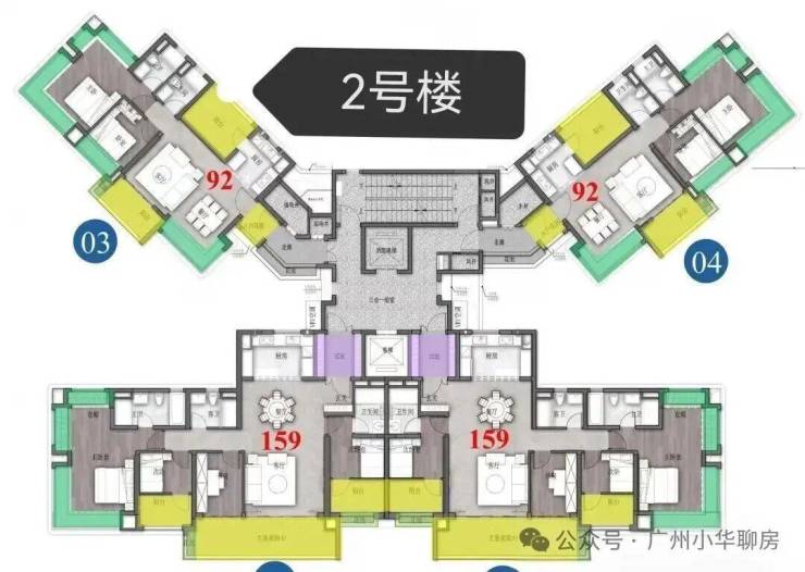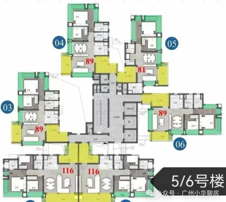 保利招商华发中央公馆采用了围合式设计,6栋47层高塔楼设计,小区自身配建有文化体育场馆和幼儿园,除了2#楼王是两梯四户,其余均为三梯六户,8#是5层高的文化馆,9#是配建3层高的幼儿园。