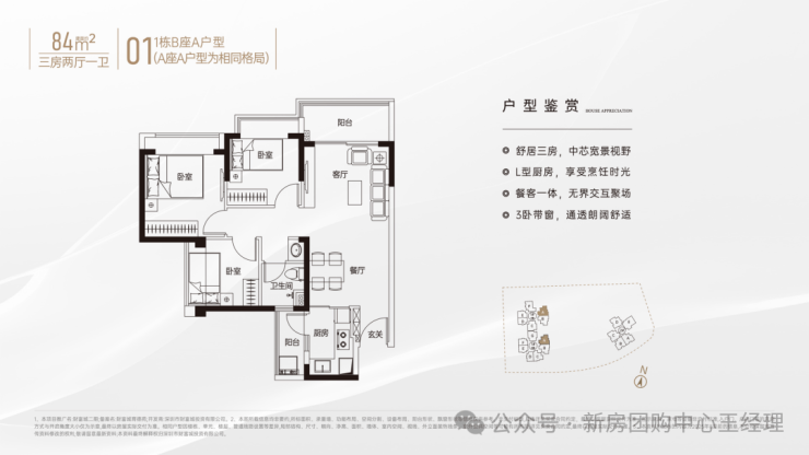 竖厅格局,客厅3.4米开间,LDKB一体化设计,动静分区,L型厨房还带1个生活阳台,卫生间三段式干湿分离,得房率约79%(不含赠送),东北朝向。
