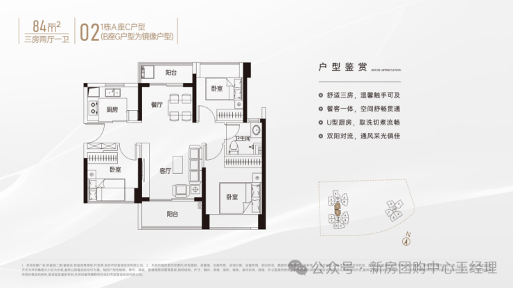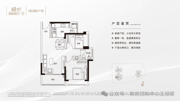 竖厅南北通透格局,客厅3.4米开间,客餐厅双阳台分离化设计,U型厨房,卫生间干湿分离,得房率约79%(不含赠送),客厅阳台主朝东北向。