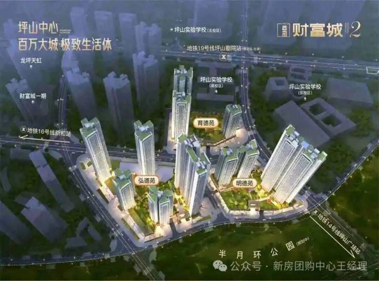 【财富城二期】是整个坪山最核心的地段,汇聚了高铁、三条地铁、两所学校、一个公园和六馆一城等全方位的生活、市政配套,当之无愧是坪山最适合居住的片区。