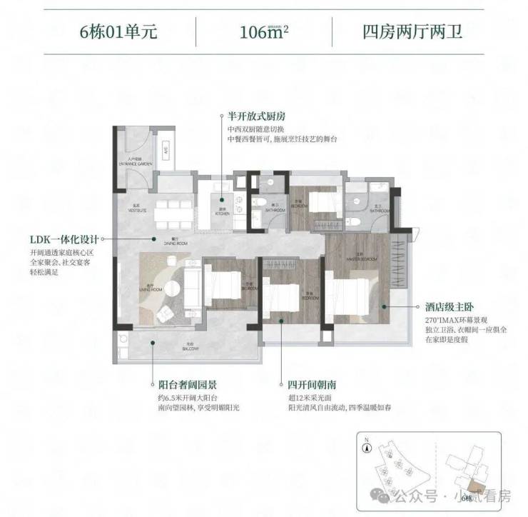 按照规划,项目商品房位于地块西侧,包括6栋层26-33层住宅,以T5风车型全南向户型规划布局。容积率3.4,计容建面9.86万㎡,得房率基本超100%,拥有1.8万㎡围合式大园林及1.5万㎡红线内外绿化与江景资源,致力打造成白鹅潭品质舒居标杆。
