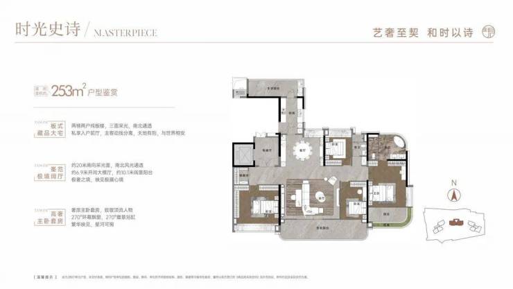 253平是四房两厅两卫户型,竖厅设计,南北对流,阳台有10米长,特点是主卧的飘窗和主卫都是270度弧形采光面,视野采光一流。