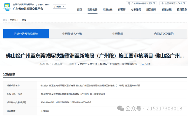 9月16日,佛穗莞城际广州段同步启动3个招标,包括施工图审核、规划测量、控制测量及施工测量检测工程项目。招标公告显示,线路已获得《广东省发展改革委关于新建佛山经广州至东莞城际铁路鹭洲至新塘段项目可行性研究报告的批复》,项目业主为广州地铁集团有限公司。
