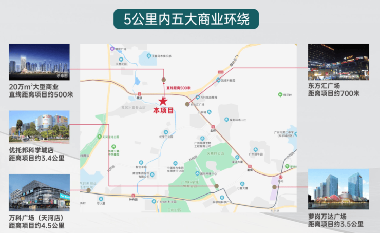 另外,项目周边自驾距离约5公里范围内,萝岗万达广场、萝岗奥园广场、天河万科广场等,足以满足大型多元消费需求。