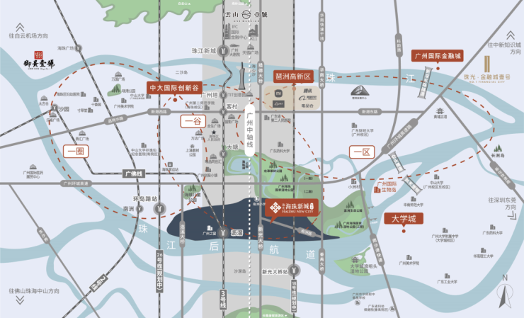 珠光·海珠新城的交通优势相当突出,周边涵盖3座跨江大桥+2条规划隧道,快速连接珠江南北。此外,多条地铁线路汇聚,无缝接驳广州核心商圈:
