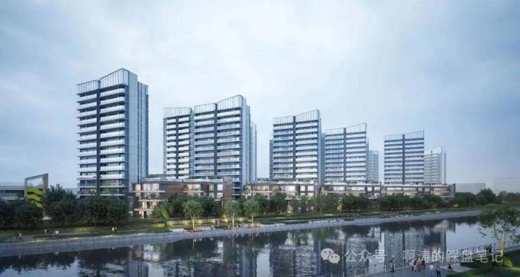 户型排布从石榴岗河自东向西依次升高,保证了约300米宽的生态水景面。