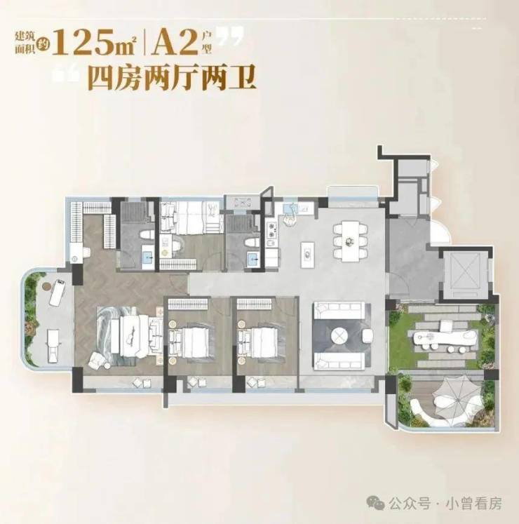 还有 125㎡的大四房,适合想改善居住条件的家庭。这个户型是南北对流的,客厅和餐厅分别对着两个阳台,夏天打开窗户就能穿堂风,连空调都省了。主卧面积超过 20㎡,除了衣帽间和卫生间,还能隔出一个小书房,晚上加班不用去客厅打扰家人。次卧里有一个带飘窗的房间,可以做成老人房,采光好又安静;另外两个房间,一个给孩子,一个做成多功能房,平时可以办公、健身,家里来客人也能当客房。厨房旁边还有个储藏间,平时囤的零食、日用品都能放进去,家里不会显得乱。
