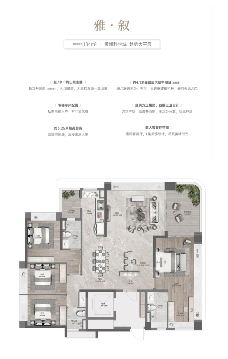 全能第四代住宅。阔绰楼间距,视野开阔,户户观山,户户观园。户型设计以空间享受型为主,三面采光、南北通风对流。每户均带入户花园满足入室清洁及收纳,户内格局方正,大开间,大景观阳台,IMAX主卧超宽景观,空间户型可随意设计调整。