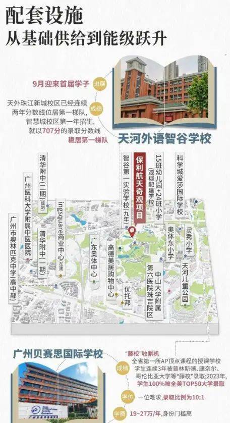 天河·保利辰园湖境项目自身配建有华阳小学(公办)(已签约引入),确保了基础教育资源的家门口一步直达。同时,项目隶属于天河区教育局划定的广州中学的官方学区范围(以当年教育局文件为准)。