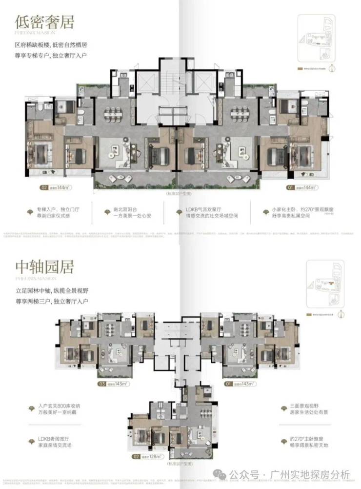 约144㎡四房两厅两卫,私梯入户,享约8.5㎡ 独立门庭!约8.5m南向景观阳台+北向生活阳台,南向四开间,约100%使用率。