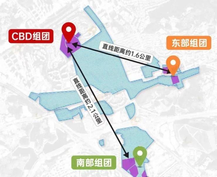 如CBD组团到东部组团,直线距离约1.6公里,到南部组团直线距离约2.1公里,中间是各种商业办公配套等等,看着就不像一个楼盘,顶多是名字上的相似性,哪个超级大盘何尝有距离相差如此之大团?