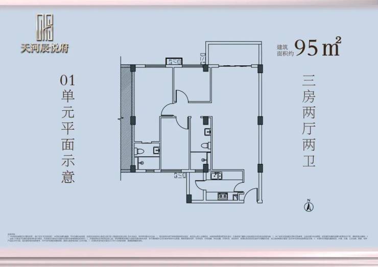 •01 单元(建面约95㎡南北对流):三房两厅两卫布局,空间开阔方正;带厨房生活阳台的户型,解放观景阳台功能;主卧约 13.4㎡且配备专属衣帽间,主卫干湿分离,公卫带窗,居住舒适度拉满。