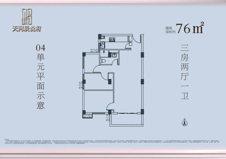 •04 单元(建面约76㎡ 南向):三房两厅一卫,南向布局采光通风俱佳;空间紧凑实用;厨房功能明确,卫生间带窗干湿分离;主次卧方正规整,性价比突出。