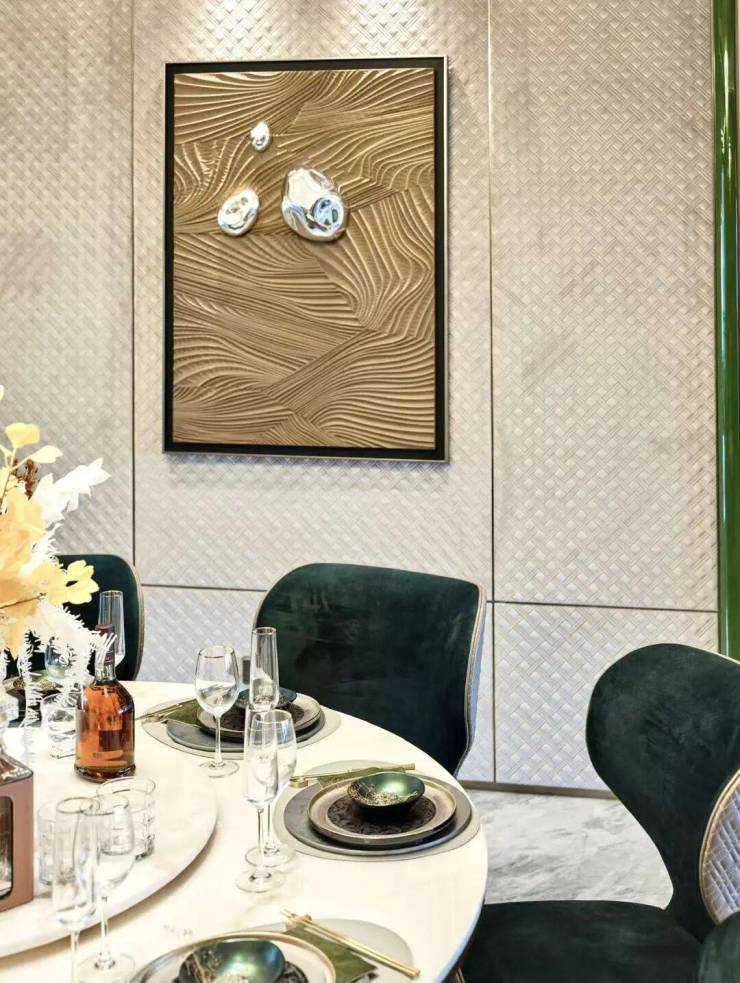 ✨鳄鱼皮编织纹墙布背景搭配鎏金翡翠奢石,通透飘逸,奢贵内敛。