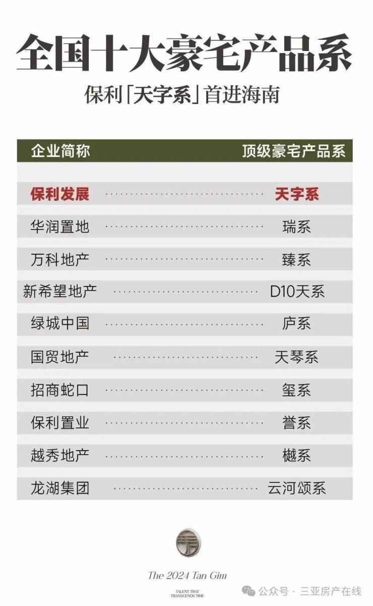 天字系,以客户需求为圆心,根据城市基座,提出“甄选城芯、产品打造、服务配置”三个方面的严苛要求,因而成为保利顶级豪宅产品系。且是全国十大豪宅产品系中首位进入海南的。