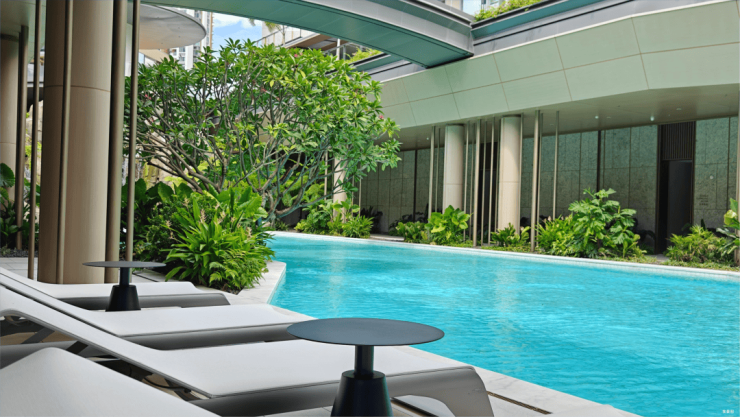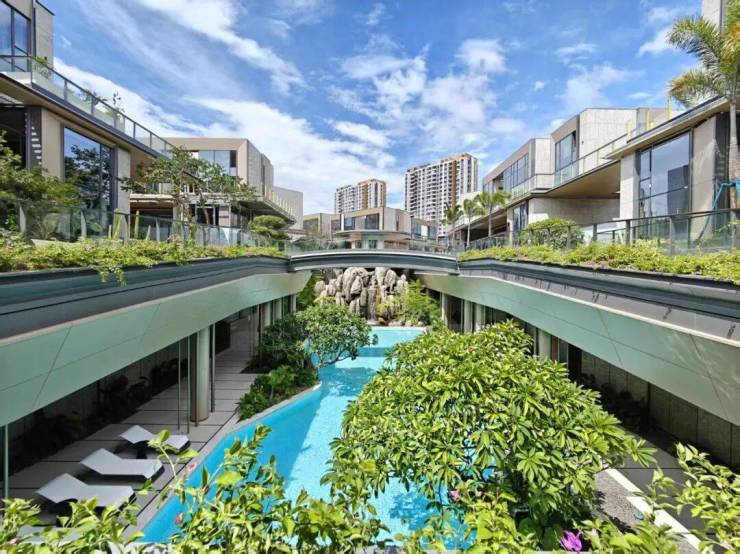 近7米高差下沉庭院环绕约40米长户外泳池,暹罗白石材铺底呈现湛蓝清澈。老桩鸡蛋花点缀其间,配合假山跌水景观(灵感源于经典设计广州白天鹅宾馆“故乡水”),营造热带度假氛围。奇珍笔筒树与粘叶荳等雨林植物层次丰富,打造沉浸式自然体验。