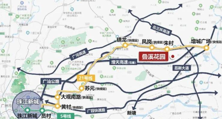 一地铁:位于21号线旁,从朱村站出发到凤岗站换乘快线,1站到黄埔,4站到天河