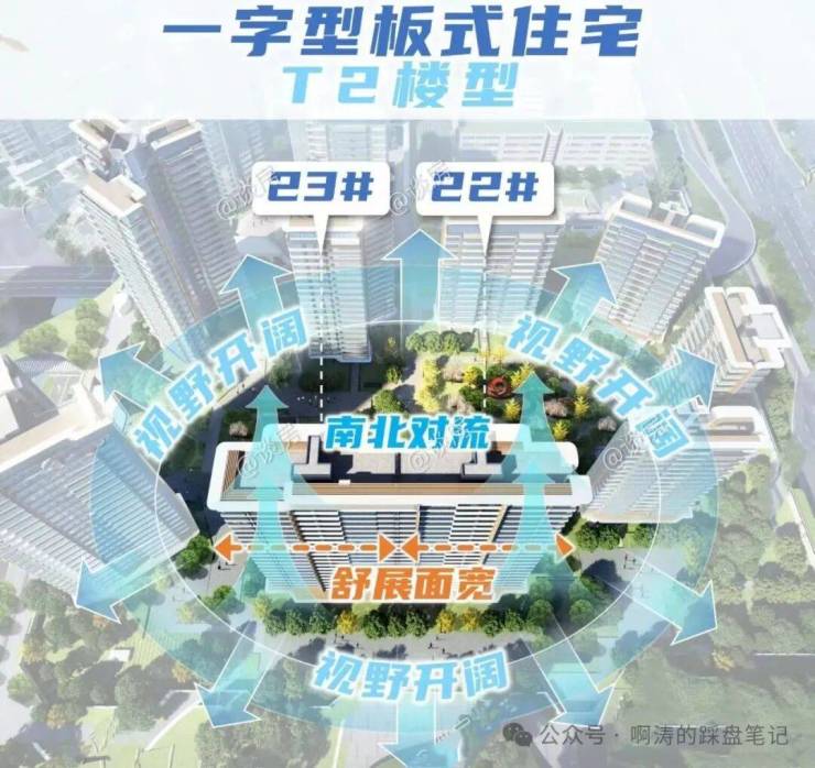 约80米的舒展面宽,T2板式楼形,占据着最好的观景和通风采光位置