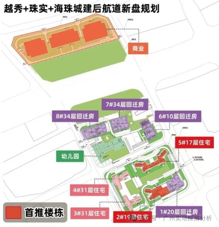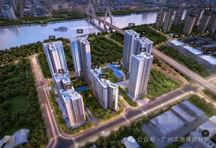 项目分三部分规划,鹤洞桥以北规划为商业,中间部分分为回迁房以及幼儿园,南部规划了4栋商品房和1栋回迁房还有3栋商业楼栋。3、4、5栋直线距离珠江仅约300米。西南向望江景和城景,东北向赏社区园林,坐拥双面视野。