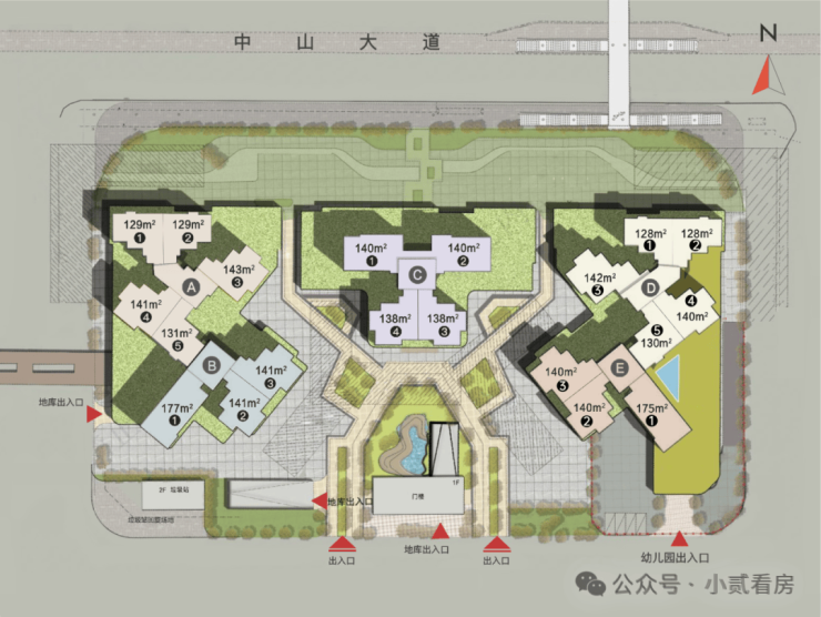 珠江天骊共建5栋塔楼,都是32层高,由于小区北向临近中山大道,因此项目北向房间会有一定噪音,南向望小区花园会比较安静。