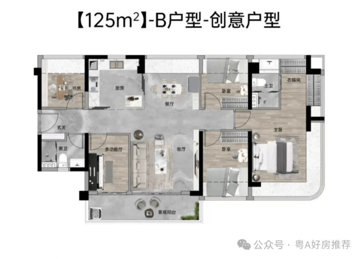 125㎡南北对流四房两卫+多功能空间,四开间向南。