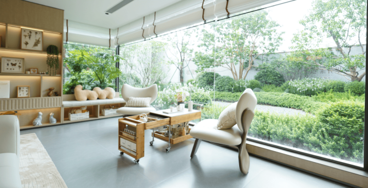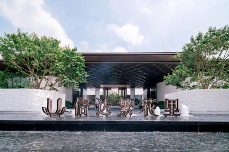 信达·繁花里萃取余荫山房的园林造景灵韵,糅合现代高奢酒店的简约笔触,打造高约9M的奢华归家门庭,配合荟萃了岭南美学的繁花艺术体验中心,为每一位归家的业主,打造尊崇的归家体验。社区外享约 2730㎡滨水公园与约 4512㎡繁花逸园,内拥逾1.5万㎡中央园林,以“三重归家礼序”铺陈,让业主每一步都是穿越风景的旅程。