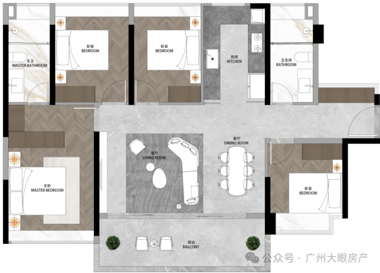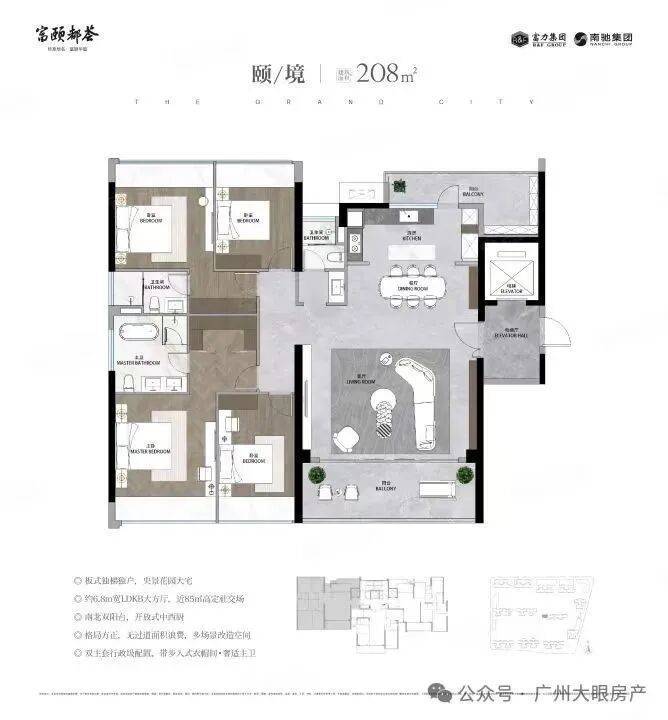 约6.6m宽景阳台,全屋空间通透感强,超22㎡主卧套间,奢阔私享空间