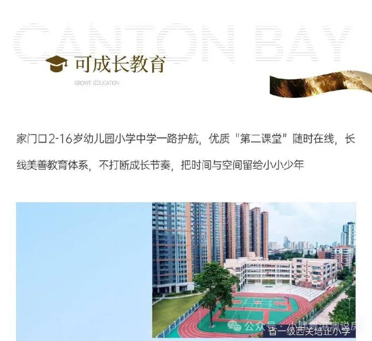 【西关培正小学】省一级百年老校,荔湾区家长心中排名第一的公立小学,原校师资,倾力打造,招生地段仅凯粤湾社区,人户一致,业主子女优先入读,不用摇号,生源纯粹,同质而居,与优秀为邻,共同进步;