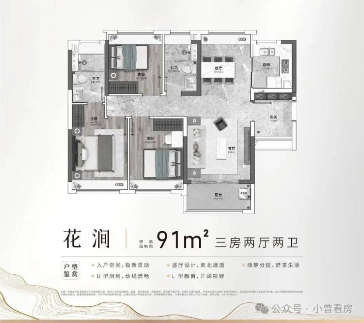 比如91平的四开间朝南+U型厨房;106平三房及四房都有大阳台,整体采光和实用空间都算出色。