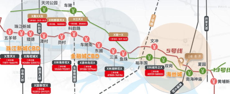 珠江新城二手均价高达15-30万/㎡;与项目4站之隔的金融城,均价也高达10万-20万/㎡。