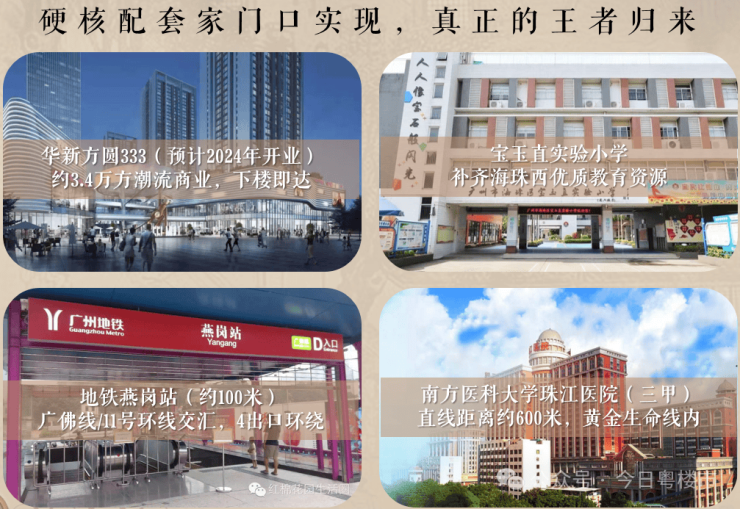 交通配套:双地铁上盖,紧邻广佛线和在建中的11号线燕岗站,在建的11号线通车后,8站可达琶洲,通过广佛线转3号线,7站可到珠江新城。此外,周边公交线路众多,自驾也可通过工业大道等快速通达广州核心区。