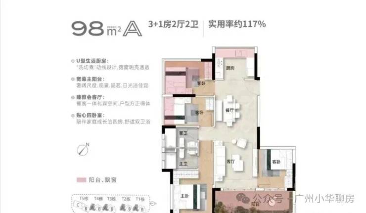整个项目有5栋10层南向板楼,三个户型分别是98平、108平和156平,全四房设计。