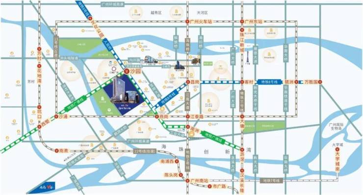 项目所在沙园站不但是串联海珠区未来千亿战略发展布局-“一区一谷一湾”的超级交通枢纽,更是海珠“一区一谷一湾”与荔湾区重点打造的广钢新城、广船新城乃至佛山千灯湖、禅城经济、消费、人口、文化连接交流的超级交通枢纽。
