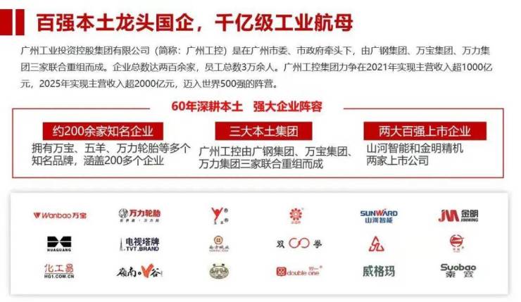 广州工控是在广州市委、市政府领导下,由广钢集团、万宝集团、万力集团三家联合重组而成的大型制造业龙头企业,由广州市人民政府100%持有,是广州十大国企之一。