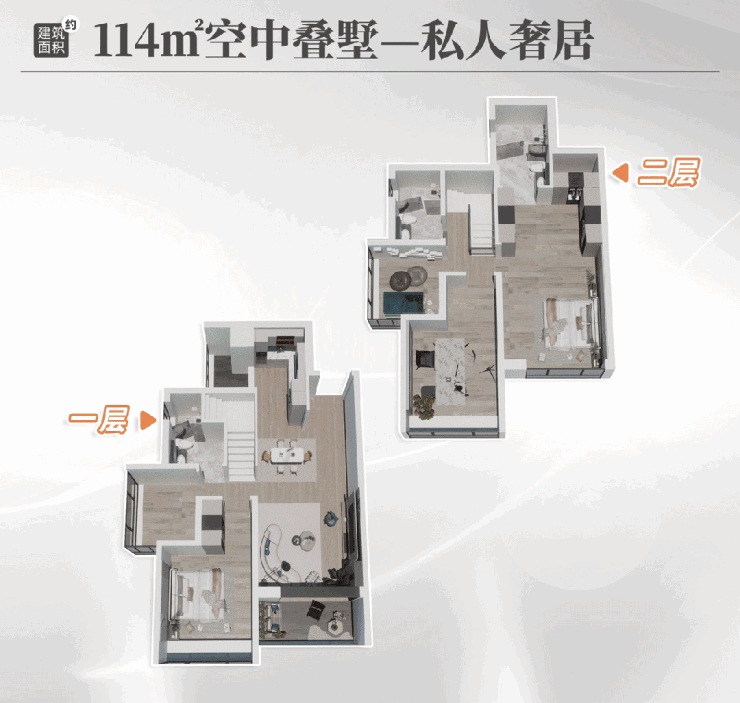 这是建面约114㎡空中叠墅,直接打破“一层不变”的局促感和弱私密性,整体空间感媲美市面160㎡的户型,据说楼梯还可以改造安装成液压电梯,让品质感更上一层楼。