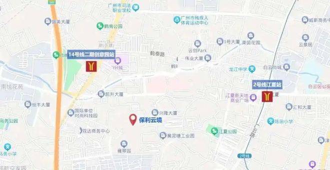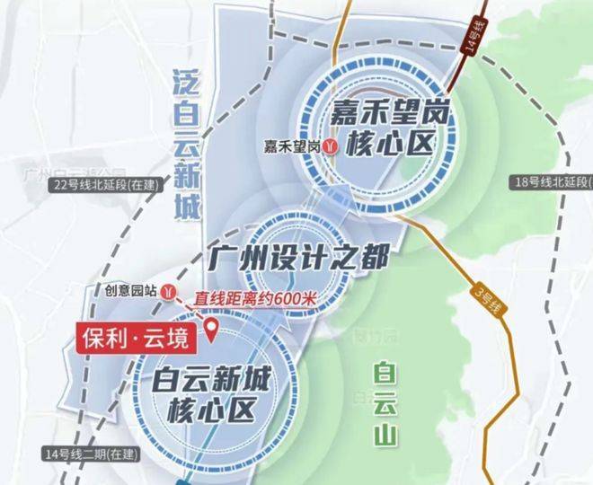 交通便捷度是衡量一个楼盘价值的重要标尺。保利云境周边构建起“三横四纵”城市主干道体系,黄石东路、广云路、机场高速、华南快速等环绕四周,自驾出行极为高效——无论是前往珠江新城、天河智慧城,还是白云机场,均在30分钟车程内。更值得期待的是轨道交通布局:项目直线距离约600米即是在建的地铁14号线二期创意园站(预计2025年通车),北上三站直达嘉禾望岗TOD(换乘3号线),南下三站抵达白云站TOD(规划7条地铁+2条高铁+1条城际)。此外,距2号线江夏站约1.3公里,也为日常出行提供了备选方案。这种“双轨交汇+高速环绕”的立体交通网络,极大提升了通勤自由度和生活半径。