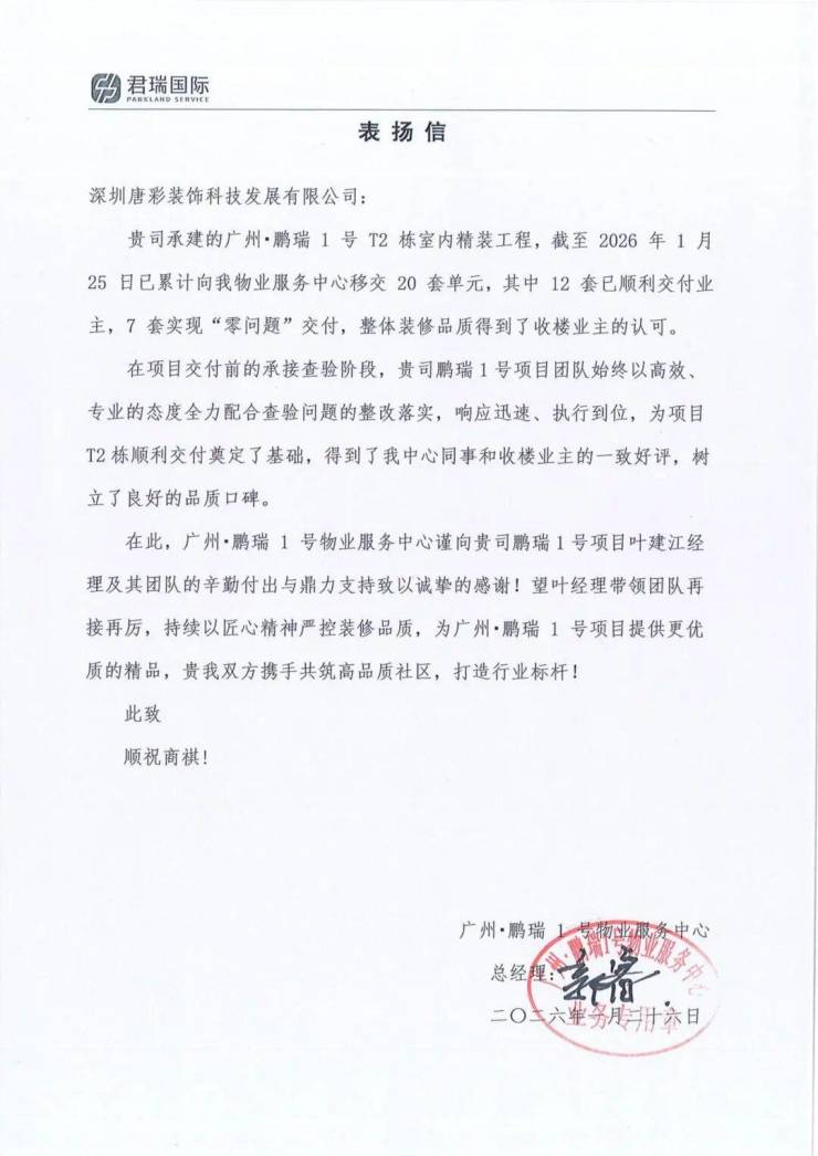 施工过程中,唐彩装饰以精细化管理攻克多项技术难题,通过BIM建模优化管线布局、3D技术赋能异形造型定制,精准把控空间尺寸与细节收口,确保GRG线条、弧形木饰面、双曲面风口等复杂造型完美落地;严格执行石材零空鼓、乳胶漆强光验收等高标准工艺,兼顾超高木饰面、硬包的稳定性与美观度,同时落实专项成品保护方案,全方位守护施工品质。从材料下单到现场安装,从工艺把控到细节打磨,全程以匠心践行精工标准,完美呈现施工效果,保证了项目按期交付,其中7套“零问题”交付,获得建设单位表扬及业主的一致好评!