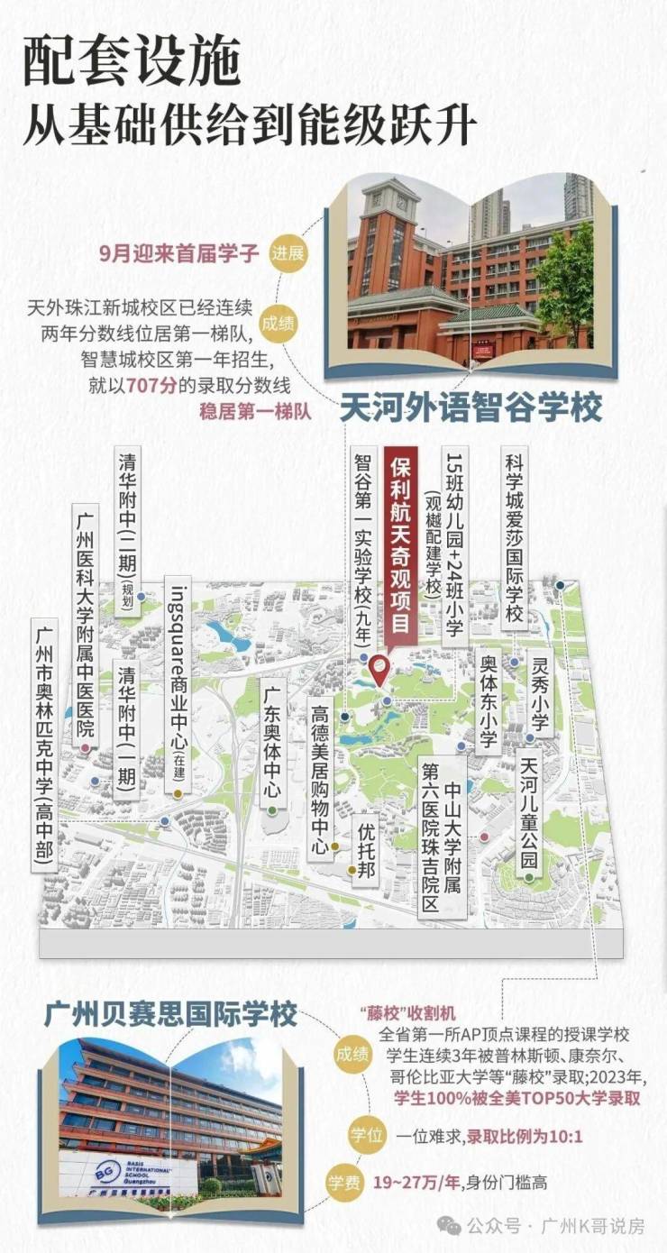 天外智谷分为两个校区,越秀观樾配建24班小学;缦云广州配建的九年制学校(18班小学+27班中学),今年9月份开学。