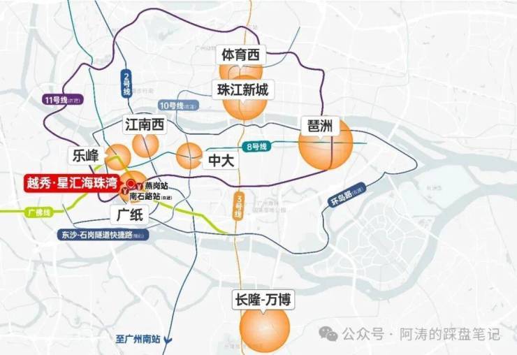 广州11号线(在建)贯穿项目,广州首条环城地铁,0换乘直达琵洲、广州火车站、广州东站;距广佛线燕岗站约450米,接入3号线,7站到达珠江新城;海珠环岛路(在建)工程进度不断刷新,价值即将兑现。