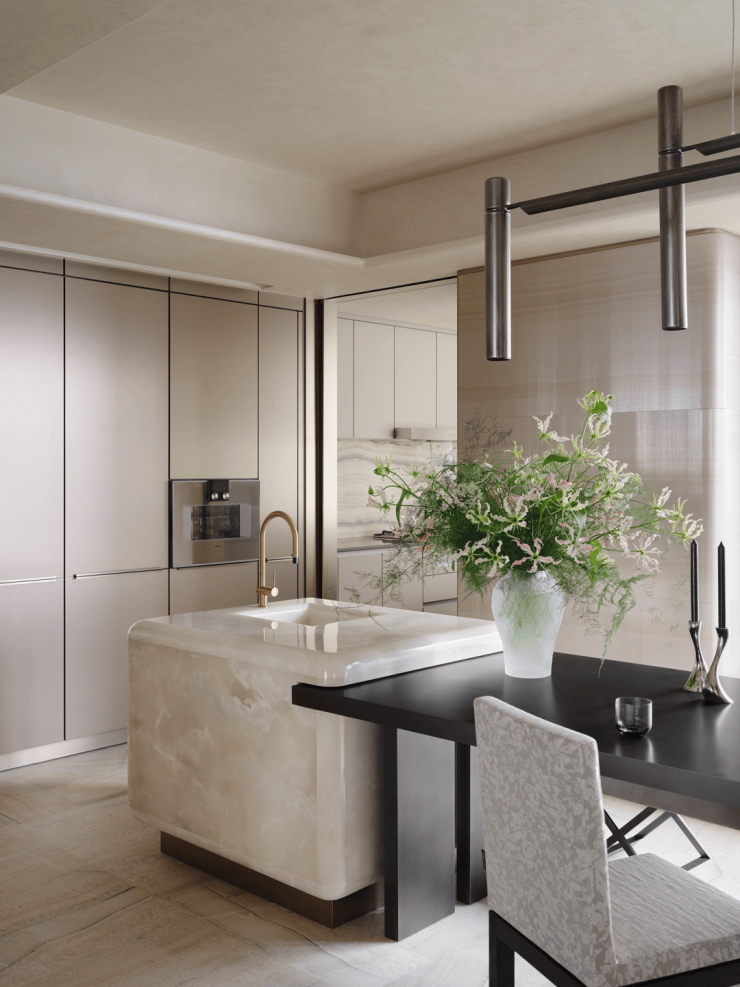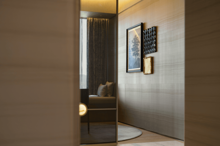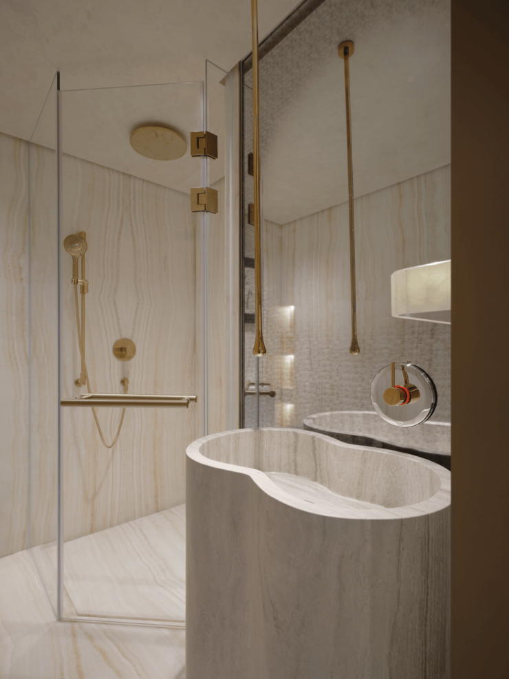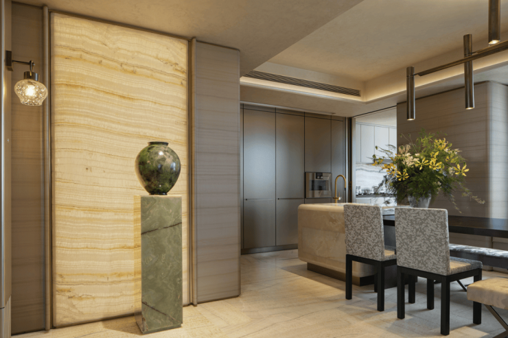 材质多样的天然大理石与Armani Casa珍贵织绣墙面,刚柔同韵在自然肌理,平衡着细腻、丰富的感觉体验,彰显典雅奢华气质。